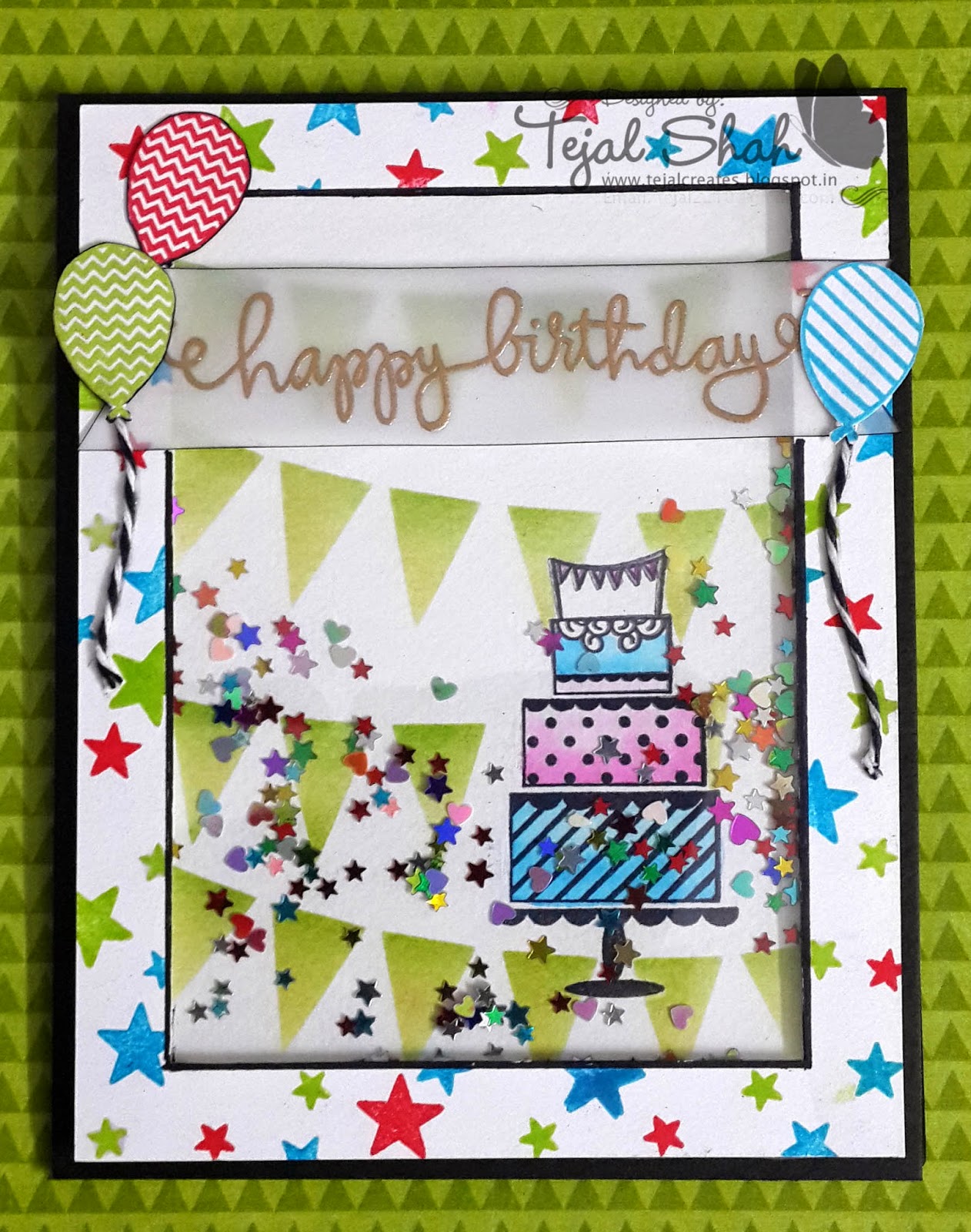 This is my second card.. I simply masked off the edges with a 1 inch masking tape and used the pennant stencil to create a background. For the shaker window, I'm using a card piece which is slightly smaller than the background. You can use the same size card piece too, in this case