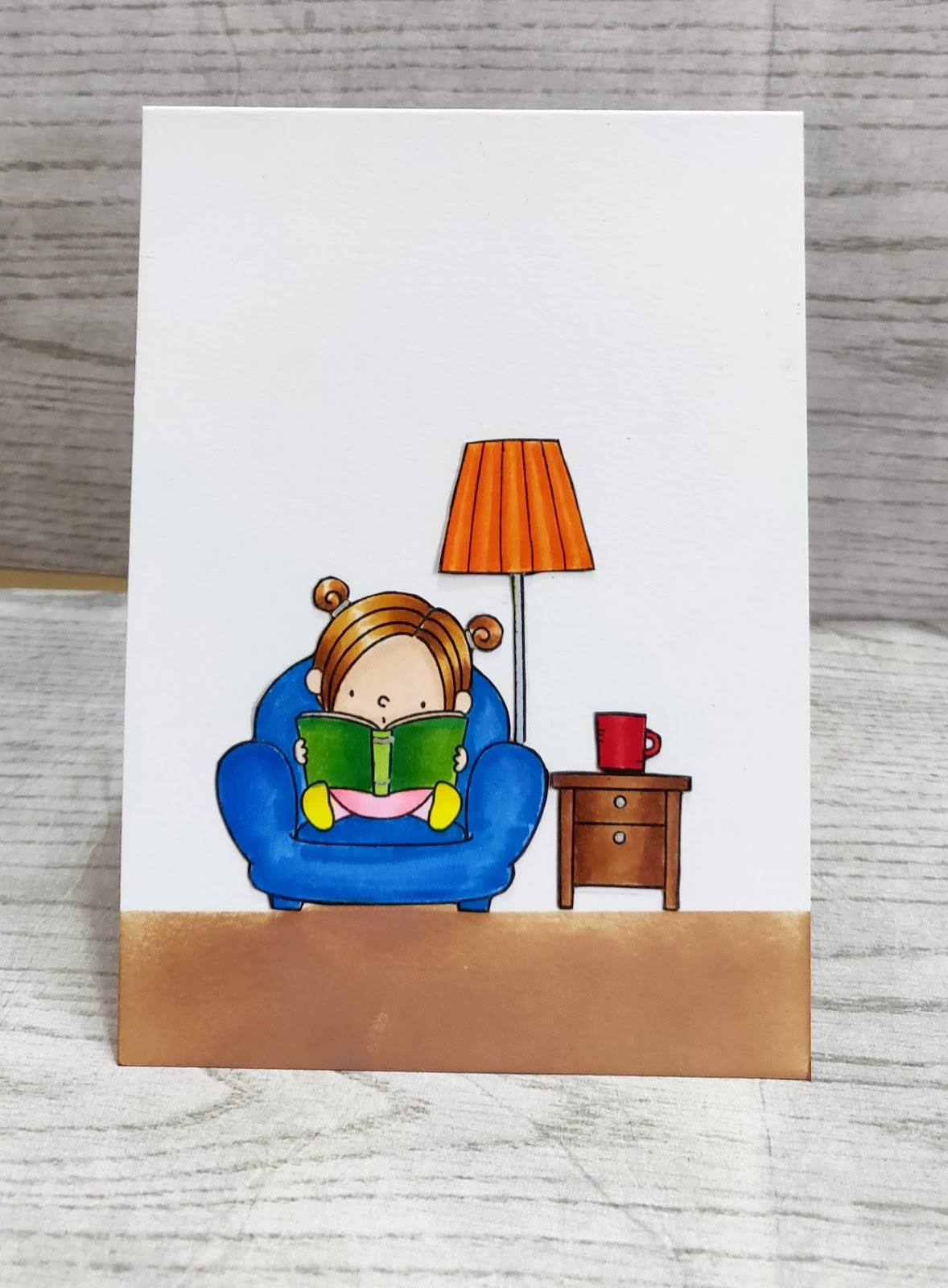 I have the little girl from MFT stamps (Our Story Stamp) reading a book and sitting with a hot cup of coffee. Images are stamped on Neenah solar white 80lbs and colored with Copics.